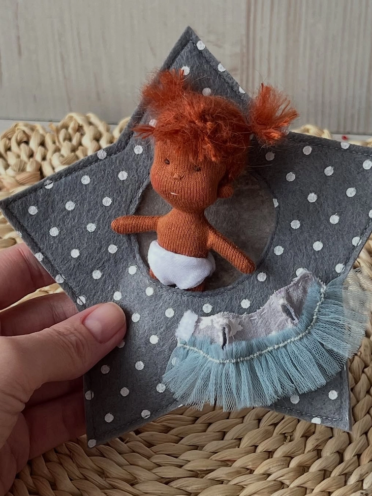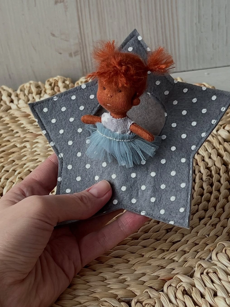 Звёздная малышка — крошечное чудо в уютном домике! Очаровательная мини-куколка ручной работы, ростом всего 8 см, станет настоящим талисманом уюта и нежности. Она такая маленькая — но приносит с собой столько тепла!